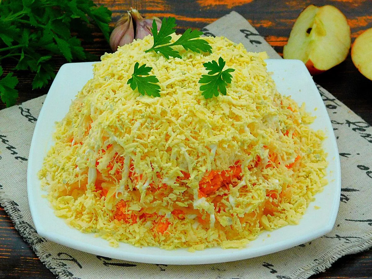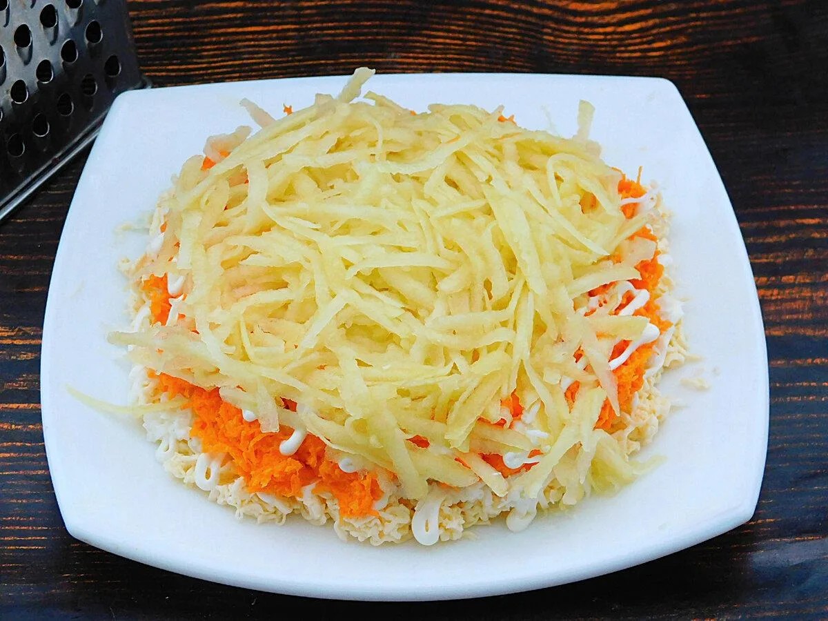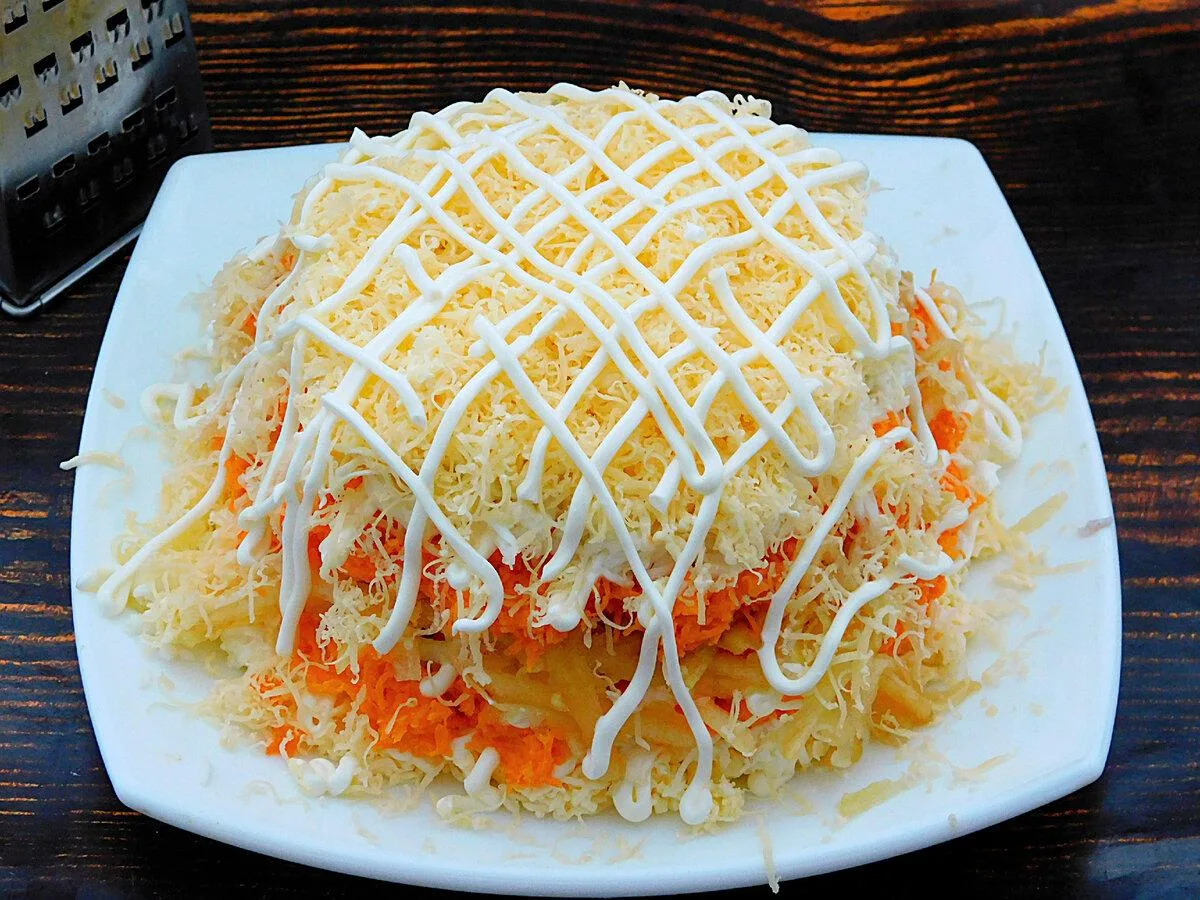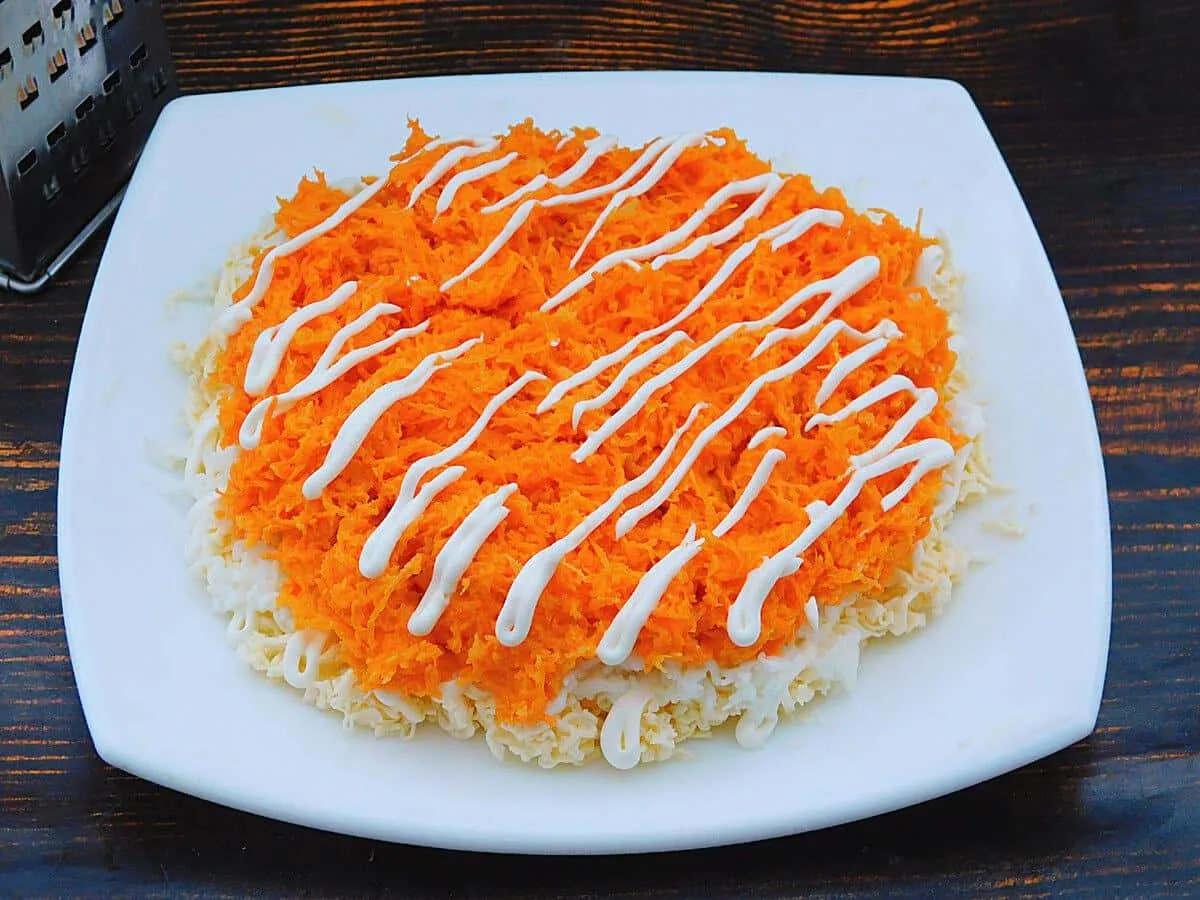Повторити всі шари в зворотному порядку, укласти моркву, білки, що залишилися сирки. На кожен наносити тонку майонезну сітку. Натерти твердий сир.