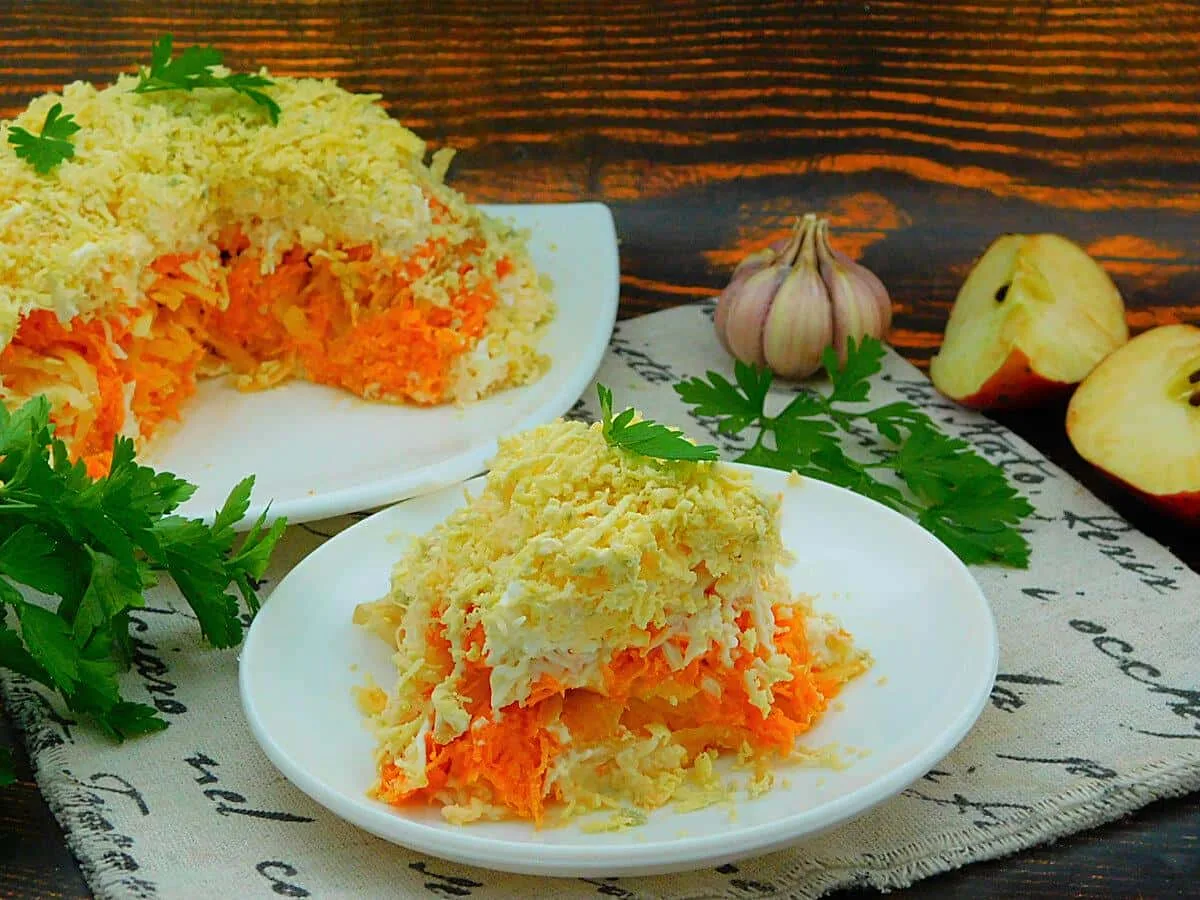Яйця зварити круто. Плавлені сирки помістити на півгодини в морозилку, так їх зручніше буде натирати. Яблуко краще брати кислих сортів, це відмінно відтінить солодкість моркви. Сиру морквину натерти на дрібній терці, додати пропущений через прес часник і ст. ложку майонезу. Змішати. Плавлені сирки дістати з морозилки і подрібнити на терці прямо на миску, на якій будете збирати салат ( на цей шар використовувати половину сирків. Нанести тонку сітку з майонезу.