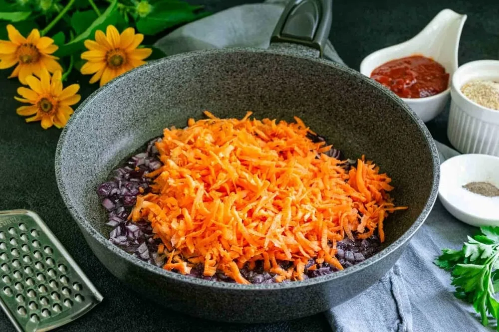 Червону цибулю очистіть від лушпиння, поріжте дрібним кубиком. Викладіть овочі на сковороду з розігрітою оливковою олією. Періодично помішуючи, пасеруйте цибулю на повільному вогні до м’якості 3-5 хвилин. Моркву помийте, очистіть від шкірки, подрібніть на тертці з великим полотном. Додайте терту моркву до пасерованої цибулі. Перемішайте овочі, продовжуйте обсмажувати інгредієнти разом на повільному вогні ще 5 хвилин.