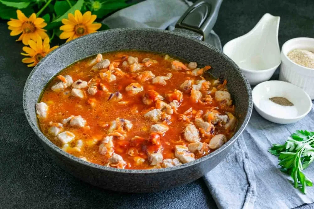М’якуш свинини або яловичини помийте, обсушіть від зайвої вологи паперовими серветками. Зачистіть м’ясо від плівок та жиру. Поріжте м’якоть кубиками невеликого розміру, додайте до сковороди з овочами. Продовжуйте готувати інгредієнти разом на повільному вогні під кришкою, поки м’ясо не змінить колір. Томатну пасту розведіть гарячою водою, перемішайте. Влийте томатний соус у сковороду. Накривши сковороду кришкою, тушкуйте м’ясо з овочами на повільному вогні протягом 30 хвилин.
