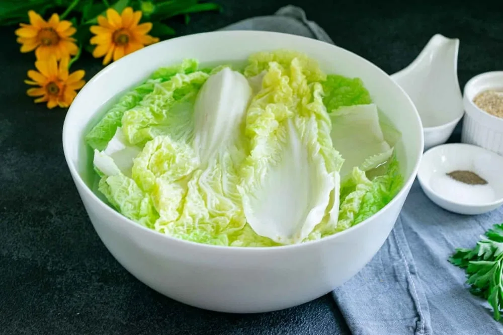 У пекінської капусти відріжте основу. Розберіть капусту окремі листи. Перекладіть листя пекінської капусти в глибокий посуд, залийте окропом, накрийте кришкою і залиште настоюватися на 30 хвилин.