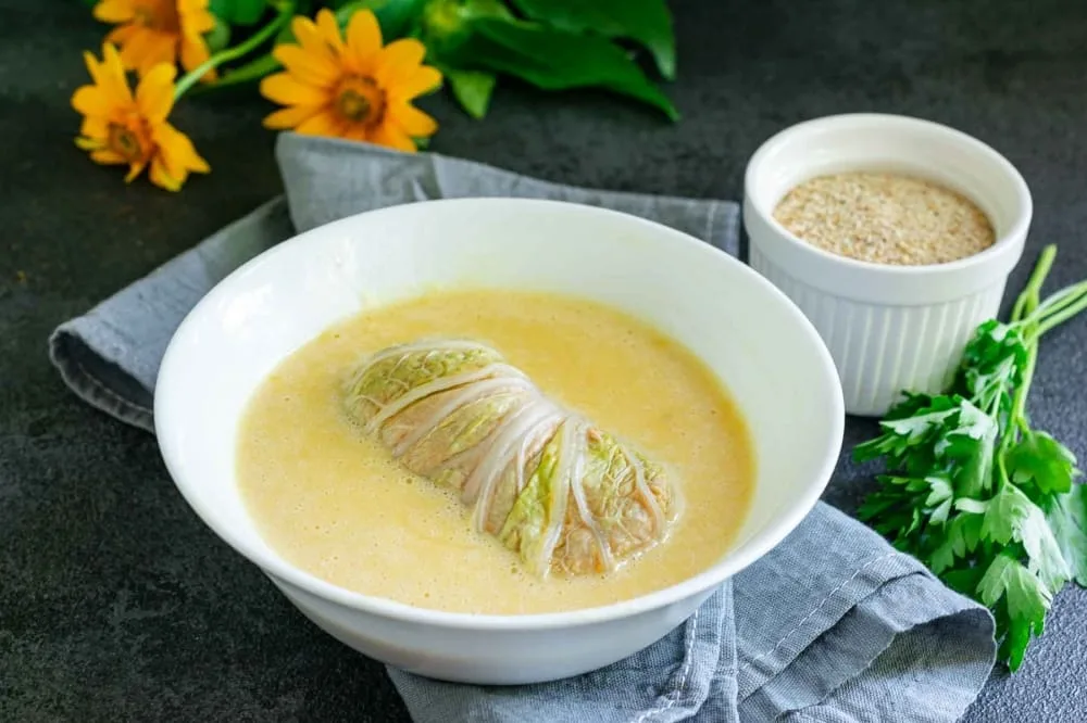 Таким чином, сформуйте всі голубці з пекінської капусти. Зі зазначеної кількості інгредієнтів у мене вийшло 12 голубців. Приготуйте кляр для голубців. У глибокому посуді змішайте 2 курячі яйця і 3 столові ложки просіяного пшеничного борошна. Можна додати трохи солі до смаку. Перемішайте кляр до однорідної суміші. Занурте кожен голубець в кляр, щоб він повністю покрився рідиною.