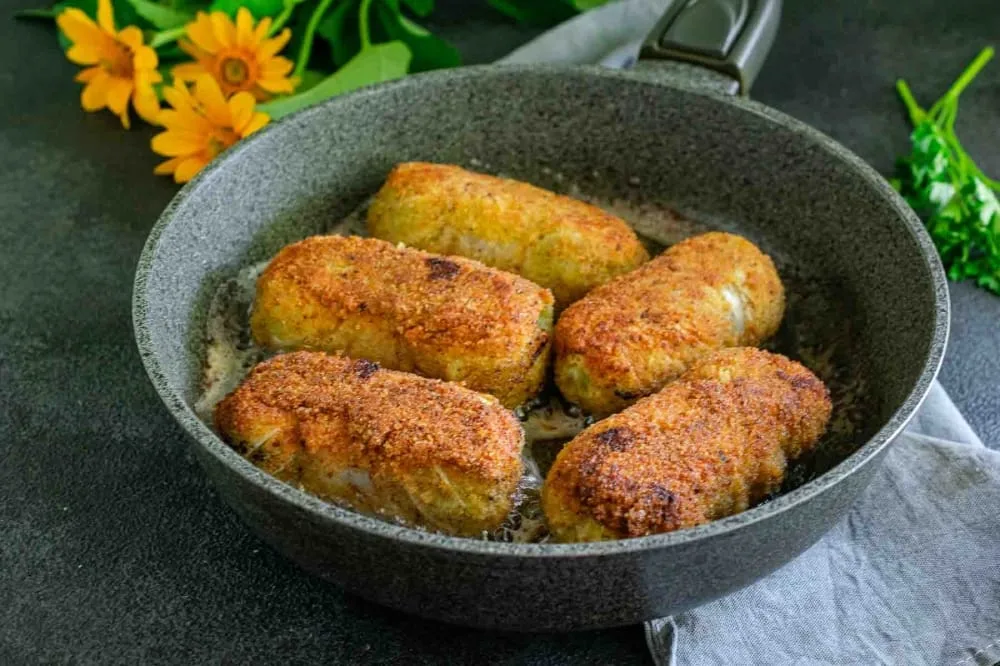 Викладіть голубці на сковороду з розігрітою олією. Обсмажте їх на середньому вогні до золотистого відтінку з усіх боків. Готові вироби викладіть на тарілку, застелену паперовими серветками, щоб забрати зайву олію.
