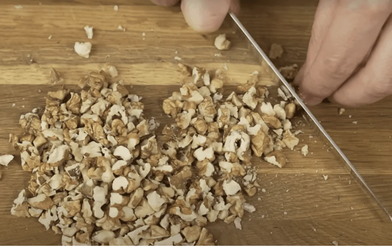 Горіхи подрібнюємо ножем на менші шматочки.