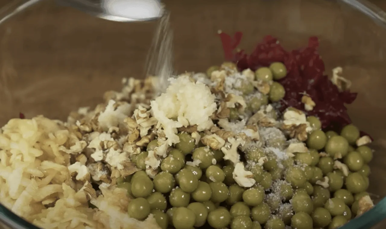Також з горошку зливаємо рідину і додаємо до решти інгредієнтів. Пропускаємо через прес часник.