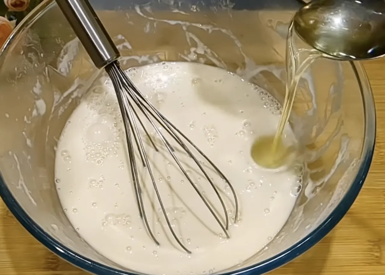 Крутий окріп 1 склянка 250 мл поступово вливаємо в тісто при постійному помішуванні. Тісто заварюємо. При цьому сода чудово гаситься окропом. Тісто виходить рідке. Додаємо рослинну олію 3 ст. л. Все з’єднуємо. Даємо тісту постояти 10 хвилин для розвитку клейковини.