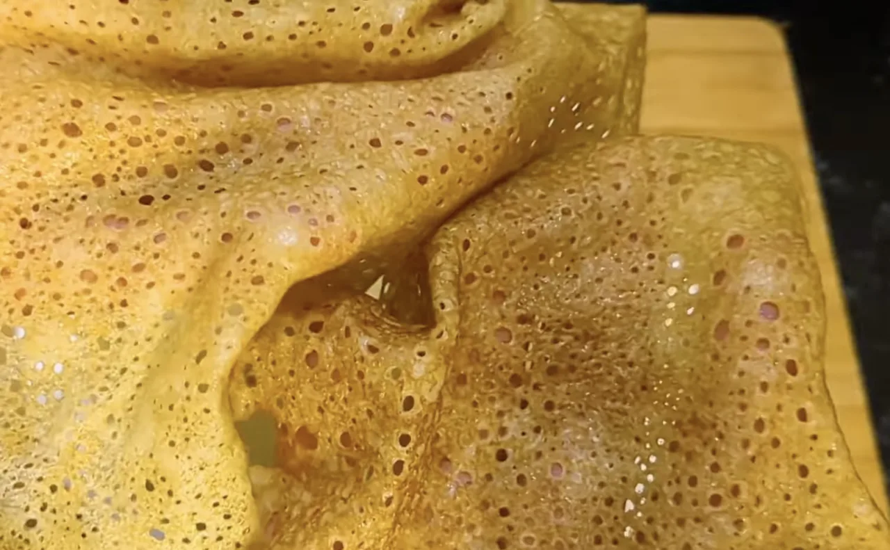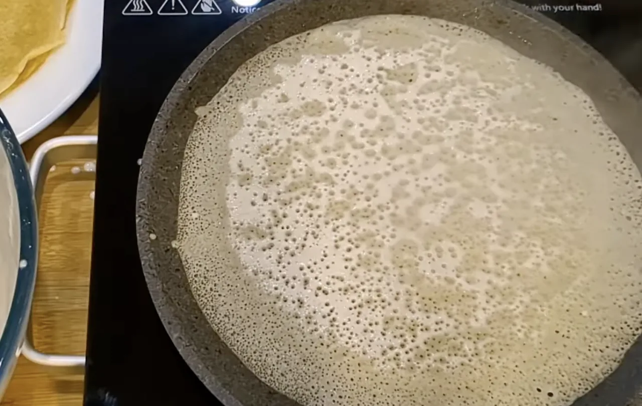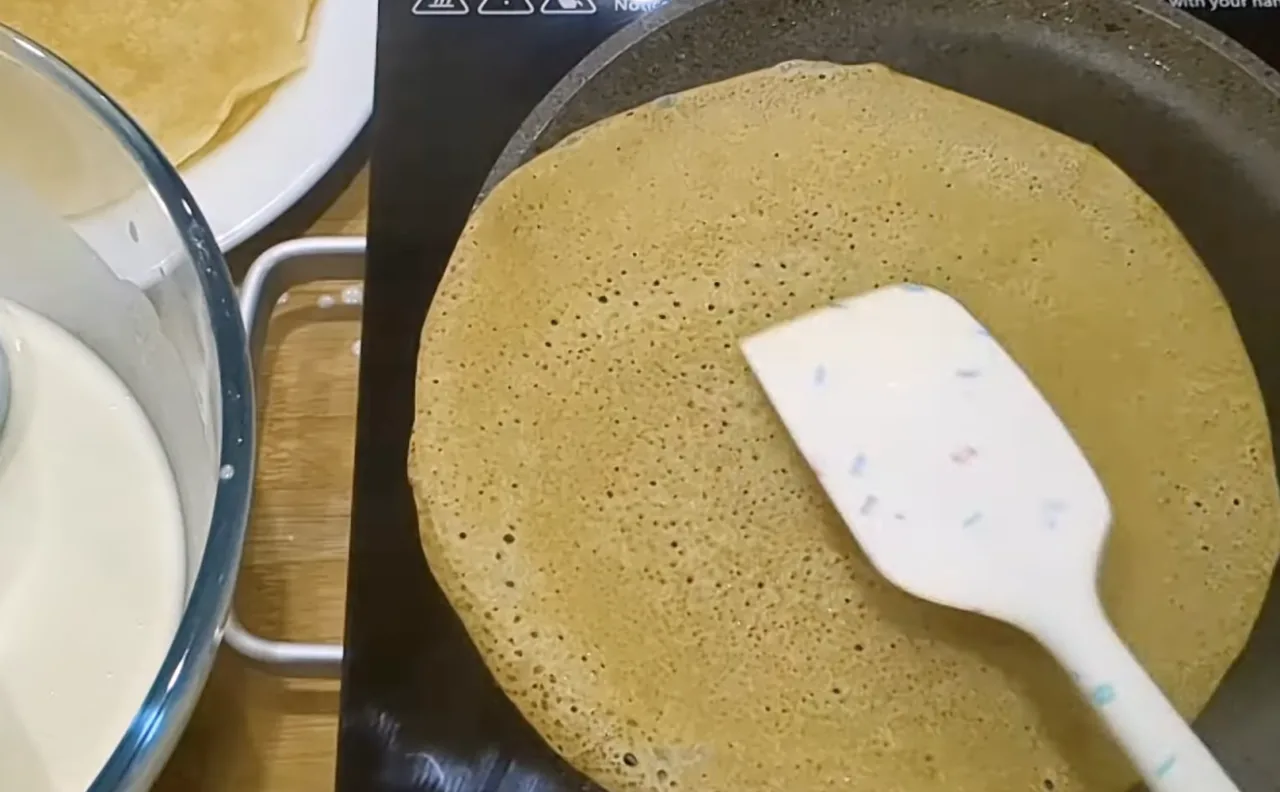 Другу порцію млинців печу з додаванням 1 склянки борошна 160 г. Млинці виходять ще тонші, ніжніші та з безліччю дірочок. Смажимо на максимальній потужності до бажаної рум’яності. Якщо зменшити потужність плити отримуємо інші млинці. Млинці дуже еластичні. Щоб млинці добре відставали від сковороди сковорода повинна бути дуже сильно розігріта.
