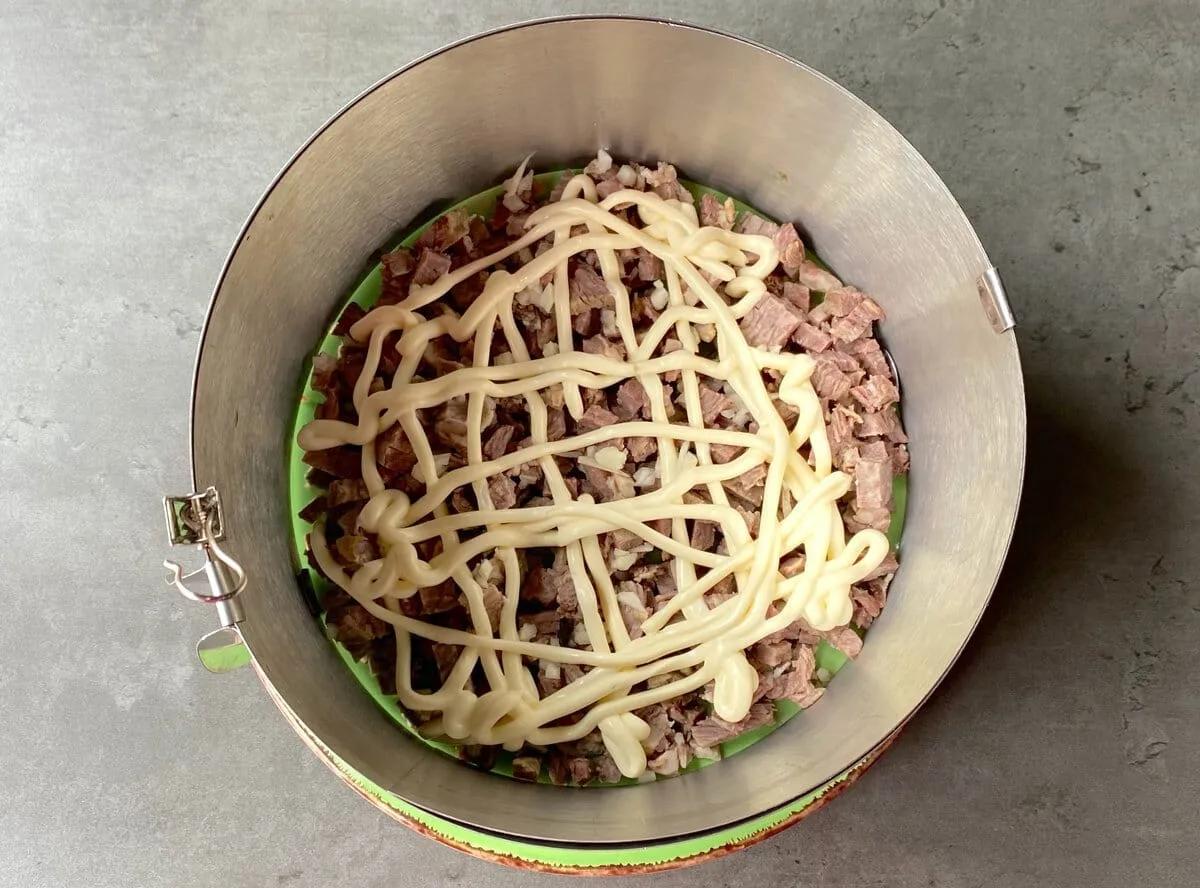 Яловичина (у мене лопатка) зварила в підсоленій воді до готовності. Остудила у бульйоні, потім нарізала на маленькі шматочки та розділила на дві частини. Виклала одну частину першим шаром, посипала подрібненим часником.
