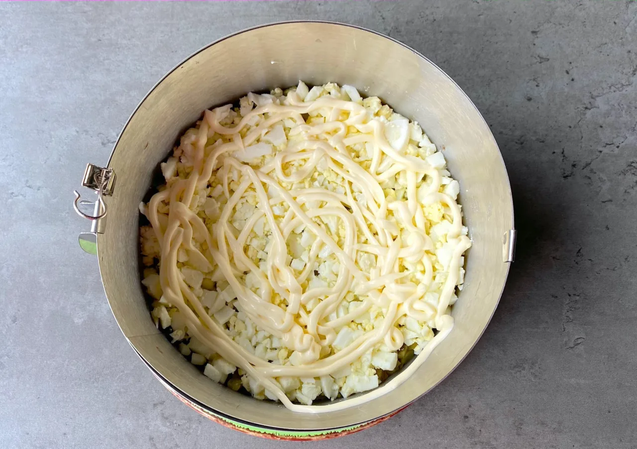 Потім виклала половину варених яєць нарізаних на шматочки. Змастила майонезом і повторила усі шари.