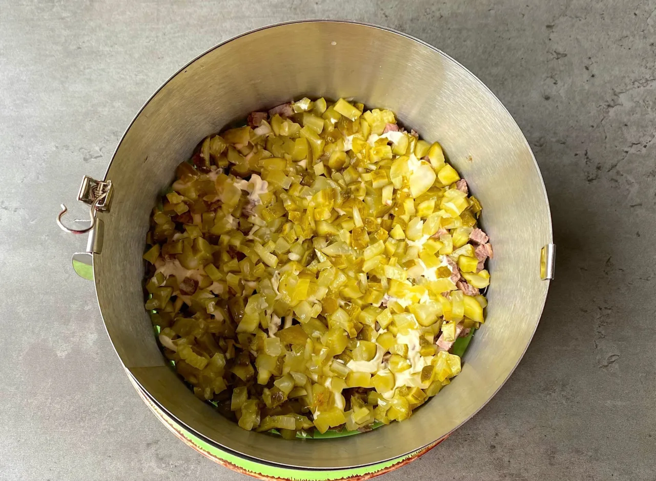 Мариновані огірки нарізала на маленькі шматочки, поділила на дві частини. Виклала одну частину огірків другим шаром.