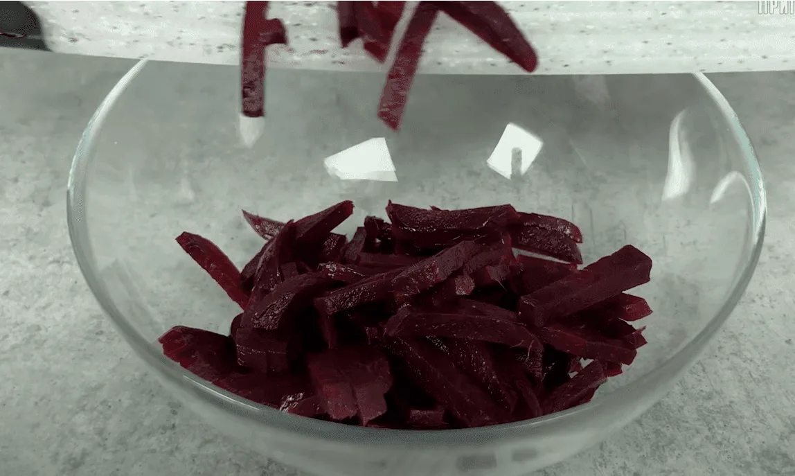 Готовий буряк нарізаємо соломкою.