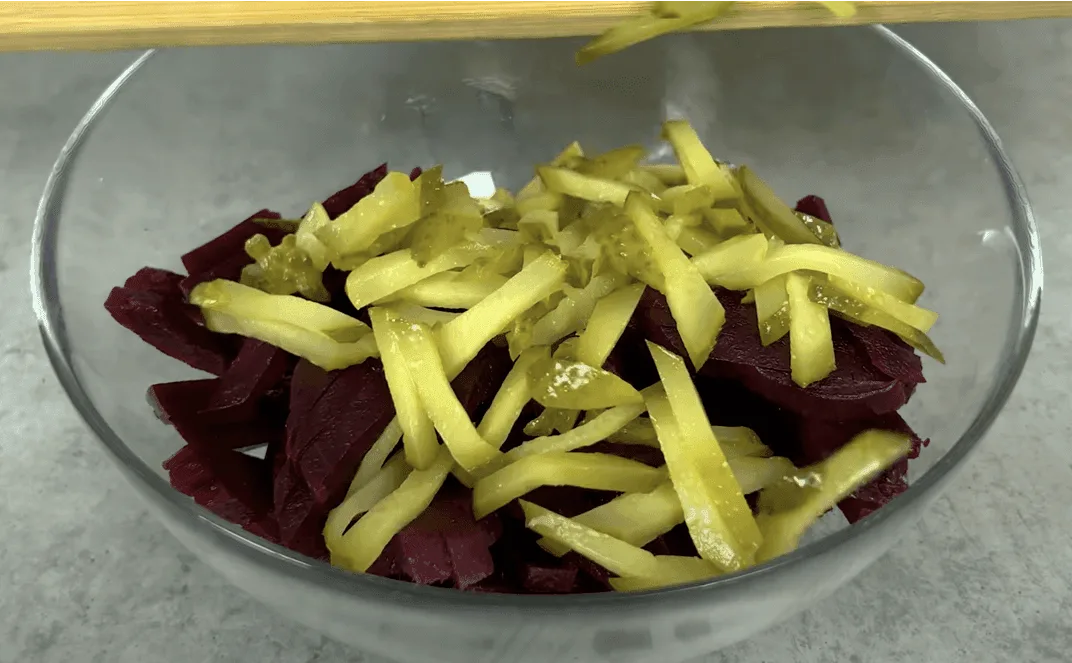 Огірочки нарізаємо соломкою і всипаємо до буряків.