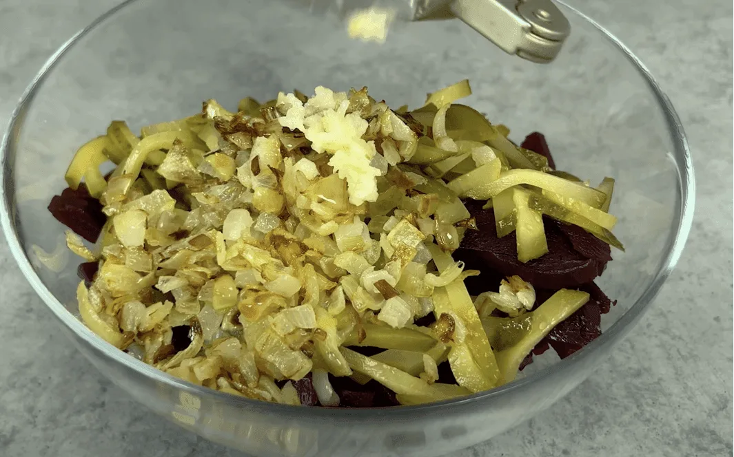 Додаємо в салатник цибулю та часник, пропущений через прес.