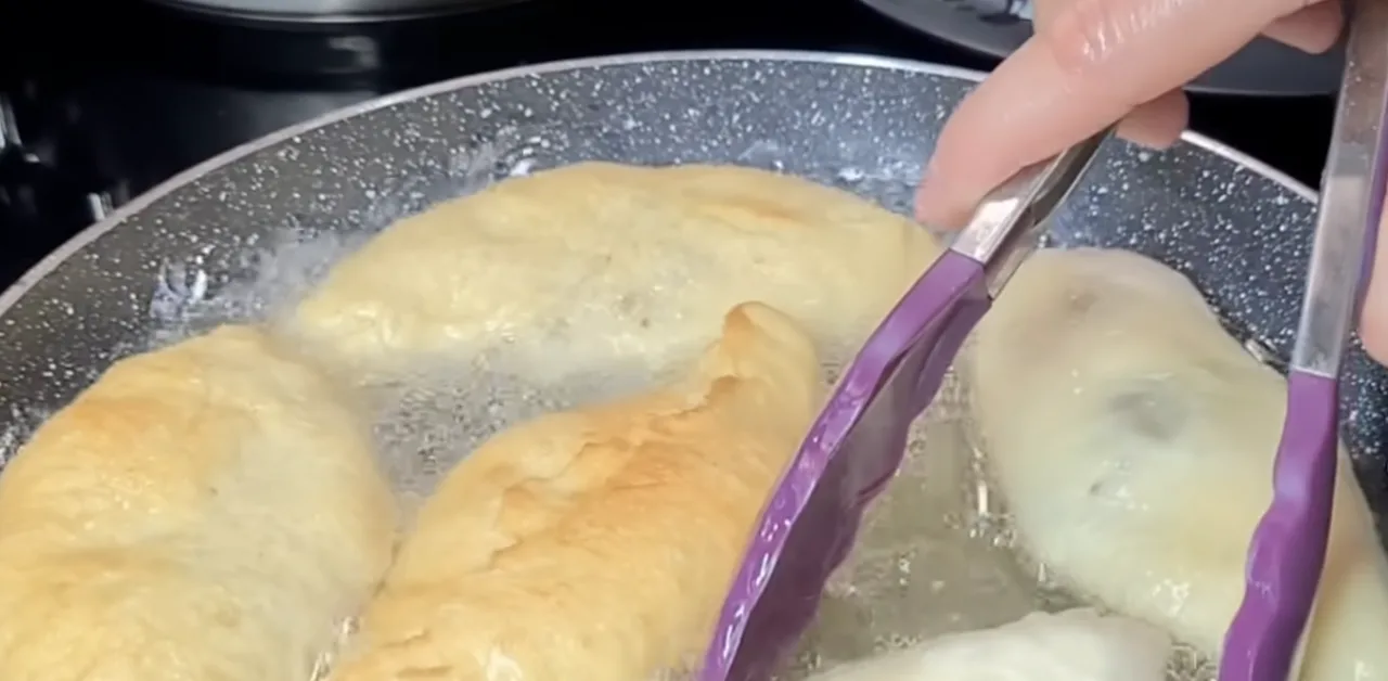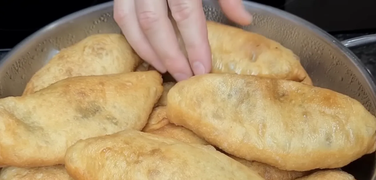 Відокремити шматочки тіста розміром з яйце. Розтягнути пальцями в невелику лепешку, покласти начинку і защипати краї. Дати постояти 5 хв. Викладати швом вниз на змащену олією поверхню. Розігріти достатньо олії, щоб пиріжки плавали. Перевірити температуру шматочком тіста: якщо тоне — нагрійте більше; якщо спливає та шипить — готово. Смажити до золотистої скоринки з обох боків.
