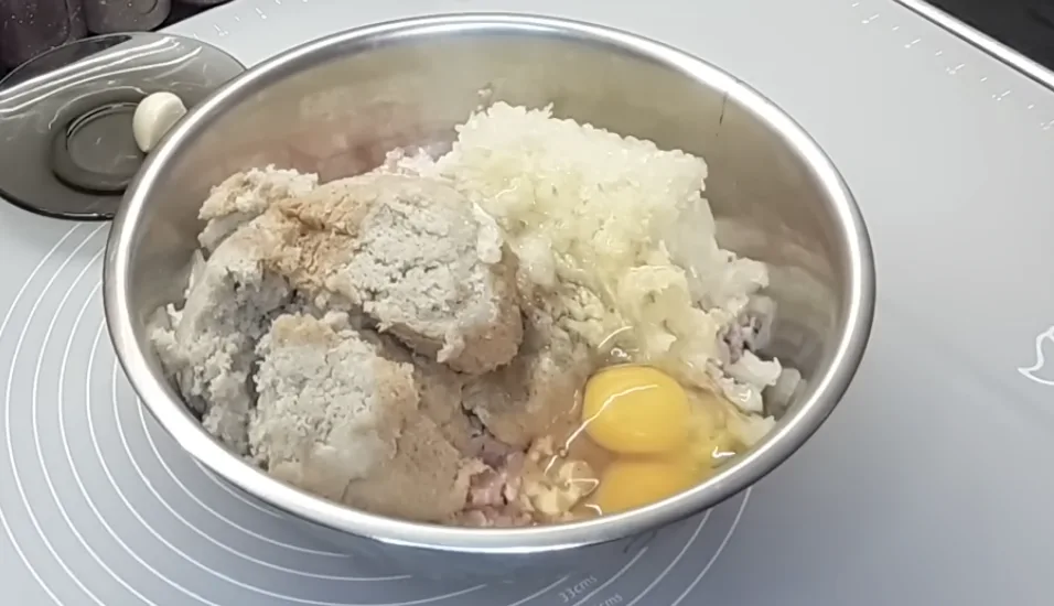 Сірий хліб замочую у воді, добре віджимаю і додаю до фаршу. Цибулю та часник дрібно натираю (у часнику бажано видалити серцевину). Усі інгредієнти з’єдную, додають яйця, сіль і перець, після чого фарш ретельно вимішую і добре відбиваю руками.