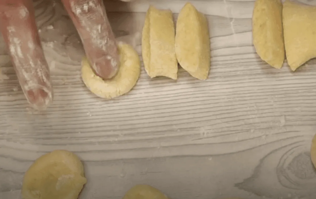 Картоплю чистимо і відваримо в підсоленій воді. Якщо в холодильнику є залишки відвареної картоплі або картопляне пюре, теж підійде. Зливаємо з картоплі воду, дамо їй охолонути. Перетворюємо в пюре, додаємо яйце, розм’якшене вершкове масло, трохи солі, 100 грамів просіяного борошна. Замішуємо тісто. Виходить дуже м’яке, трохи липке, але борошна більше додавати не потрібно. Тісто посипаємо борошном і ділимо для зручності на 2-3 частини. З кожної частини розгортаємо джгутик, діаметром 1,5 – 2 см. Розрізаємо на шматочки 1,5 – 2 см. Кожен шматочок обмокаємо липкою стороною в борошні, злегка притискаємо пальцем у серединці.