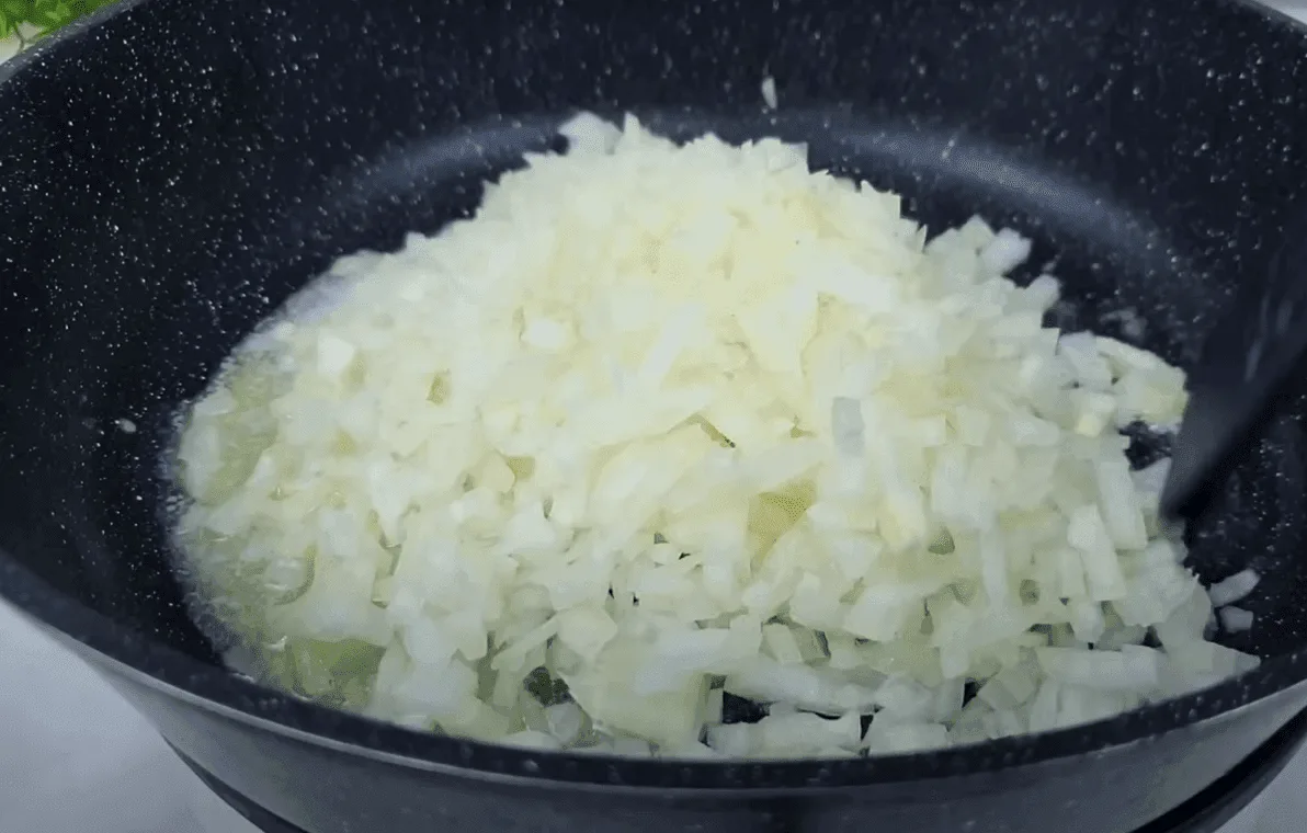 На сковороді розтоплюємо вершкове масло. Цибулю нарізаємо шматочками та обсмажуємо. на маслі до м’якості.
