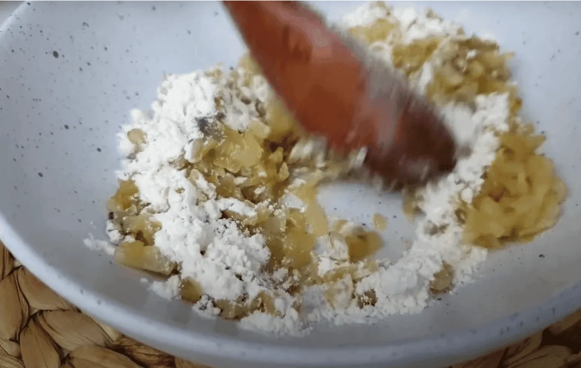 Перекладаємо цибулю в миску, додаємо сіль, перець та борошно. Перемішуємо.