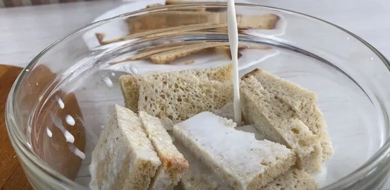 Для початку обрізаємо у білого хліба “окрайці” з усіх боків. Обрізки не викидайте, їх можна зробити сухарі. А м’якуш перекладаємо в глибоку миску і заливаємо молоком.