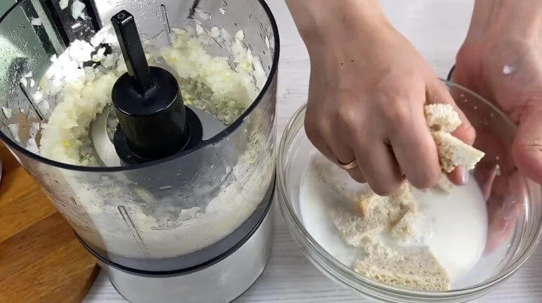 Хліб трохи віджимаємо його, щоб не було багато рідини та перекладаємо у блендер. Подрібнюємо до стану кашки.