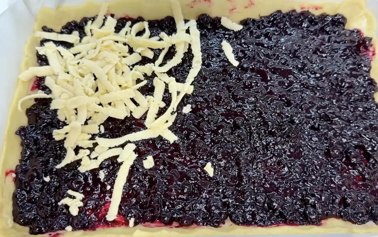Більший шматок тіста розкачуємо на пергаменті в тонкий пласт, трохи більший за розмір деко, викладаю разом із пергаментом у форму і формую рівні краї. На основу викладаю густе варення. Можна також використовувати ягоди чи фрукти, проварені з крохмалем.
