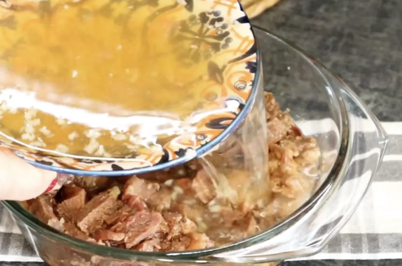 Загалом, по рідині орієнтуйтеся на об’єм приблизно 500–700 мл на одну банку тушонки. Мені здалося, що близько 700 мл — найвдаліший варіант: холодець добре застигне, але при цьому залишається м’яким і соковитим, а не «резиновим».
