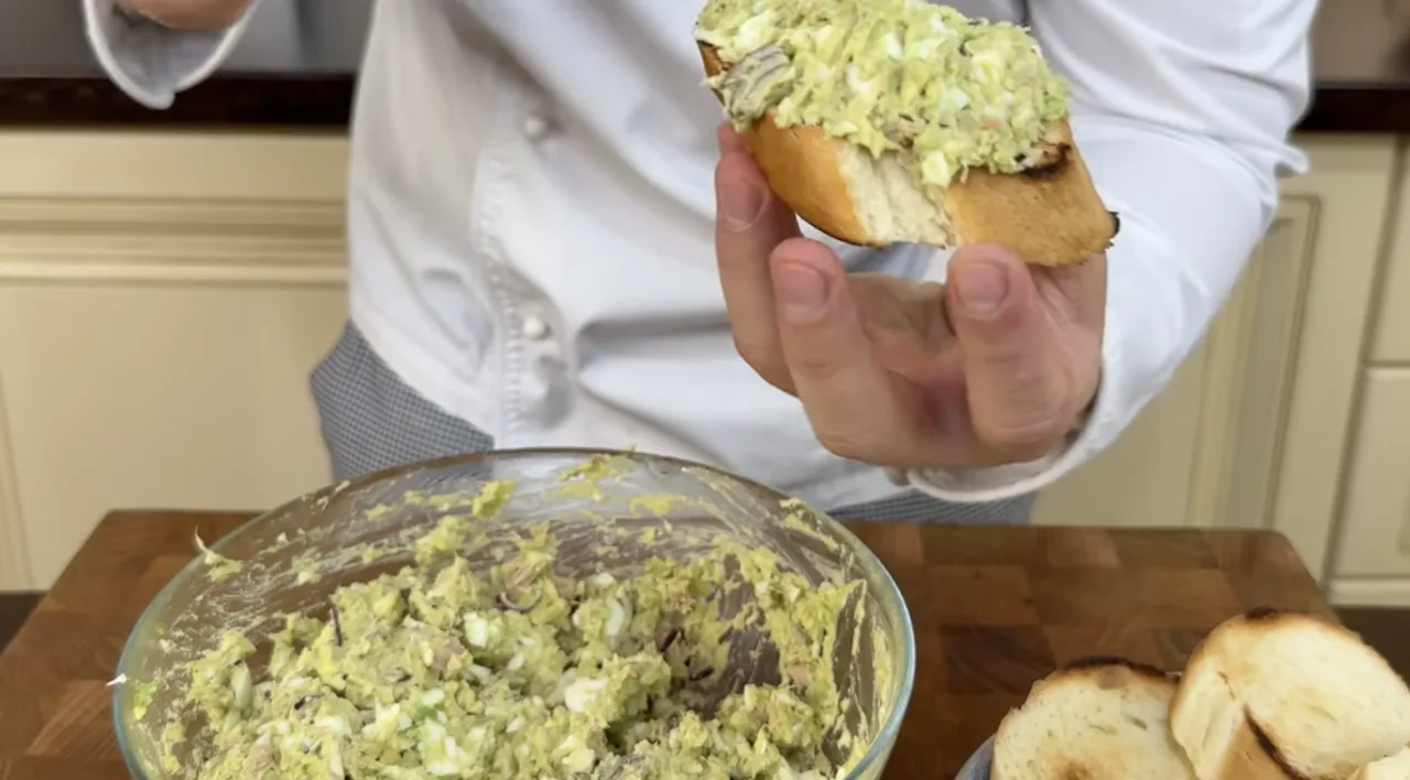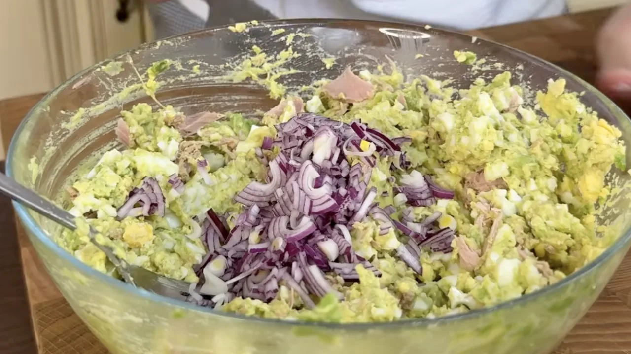Відварені яйця (7 шт.) змішую з м’якоттю двох спілих авокадо. Солимо обережно, бо тунець вже солоний. Переминаємо виделкою або товкачкою до однорідної консистенції. Викладаємо 120 г тунця у власному соку і добре перемішуємо. Нарізану дрібним кубиком фіолетову цибулю додаємо до суміші. Вона робить смак солодкуватим і дуже апетитним.