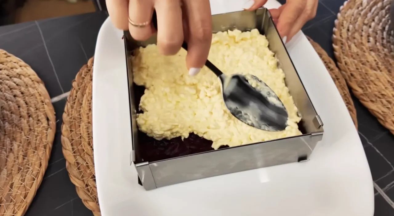 Викладаємо суміш шарами у красиву тарілку або розʼємну форму, можна прикрасити свіжою зеленню або горішками.