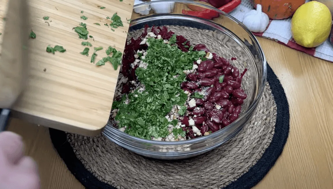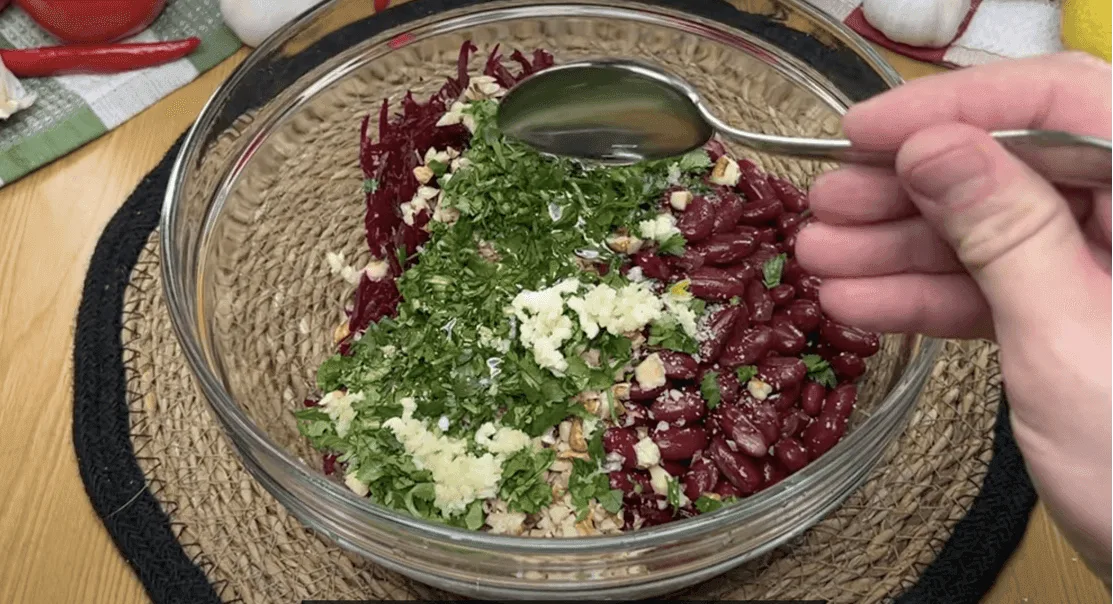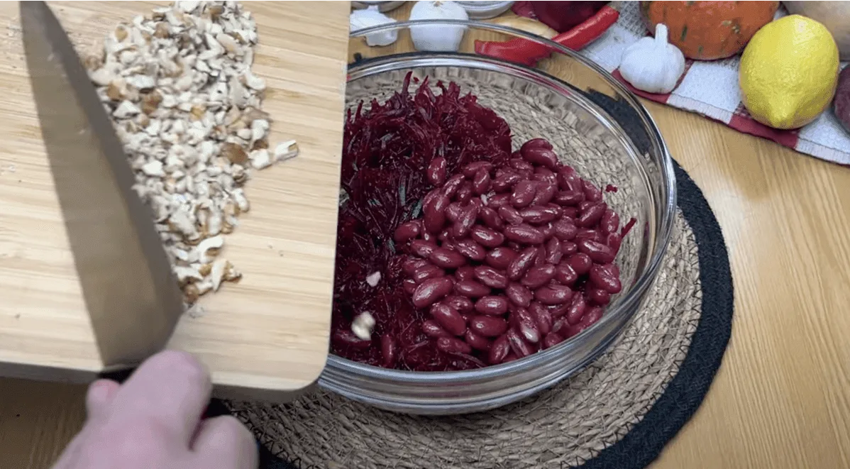 З квасолі зливаємо рідину, додаємо до буряків. Горіхи подрібнюємо ножем, всипаємо до решти інгредієнтів.