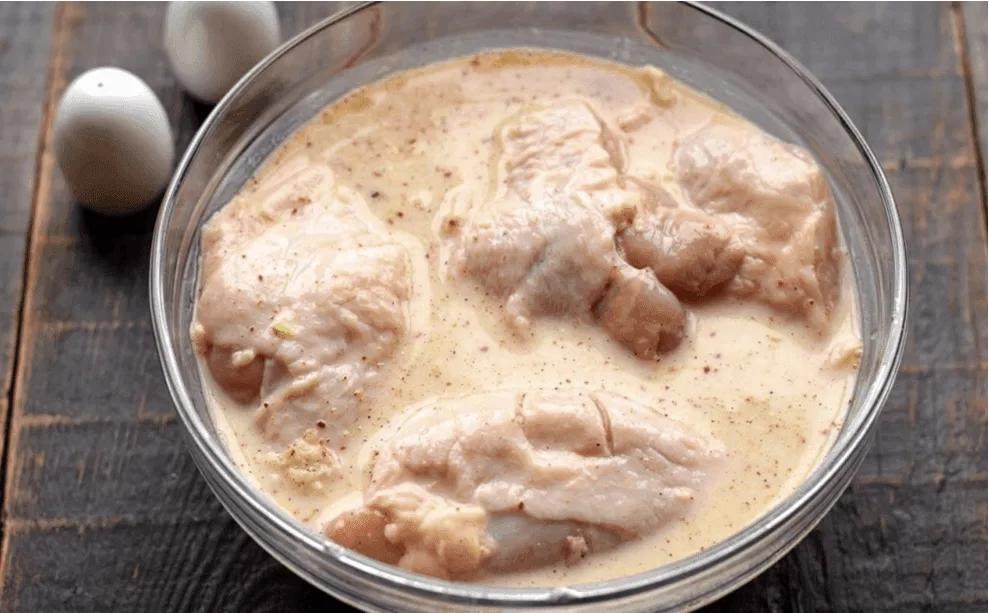Стегна опустіть в суміш кефіру, перемішайте, вона повинна повністю огорнути м’ясо. Місткість прикрийте плівкою, поставте щонайменше на 12 годин у холодильник. Найзручніше замаринувати м’ясо на ніч. Якщо ви не маєте такої кількості часу, маринуйте курку в кефірі не менше 1 години.