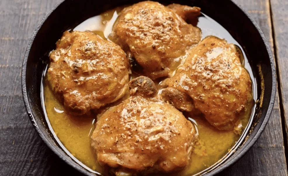 Через деякий час промариновані стегна перекладіть у жаростійку форму на відстані один від одного, зверху накрийте фольгою. Духовку прогрійте до 180 градусів, помістіть всередину заготівлю. Запікайте м’ясо наступні 45-50 хвилин. За 20 хвилин до кінця процесу зніміть фольгу, щоб зарум’янилося м’ясо зверху.