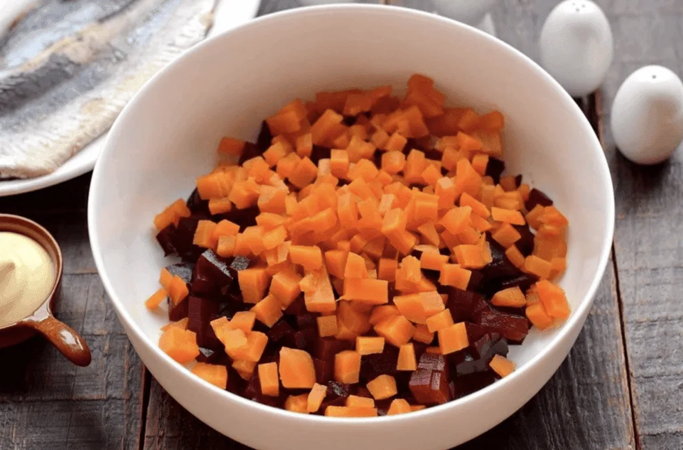 Овочі заздалегідь відваріть у шкірці. Після варіння овочі повністю остудити, очистити. Буряк наріжте кубиком середнього розміру, закиньте в салатник. Моркву наріжте також кубиками, відправте до буряків.