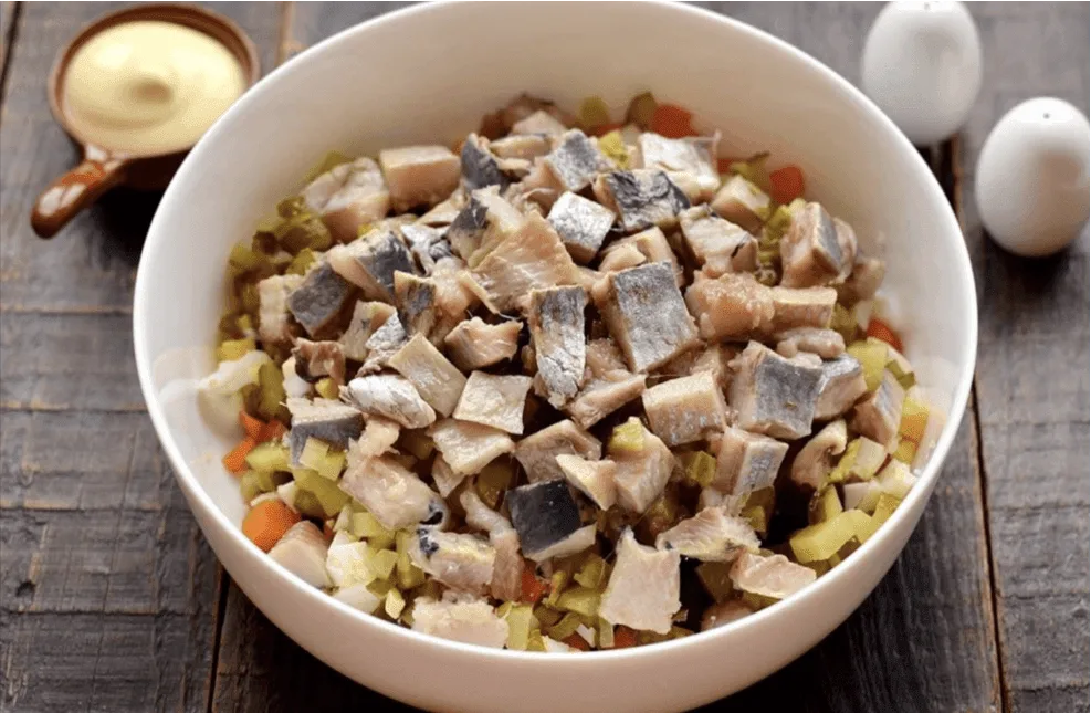 Філе оселедця звільніть від дрібних та великих кісток за допомогою кухонного пінцета. Оселедець наріжте великими шматочками, щоб вони добре відчувалися в готовому салаті.
