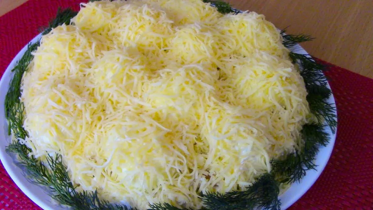 Яйця зваріть “круто”, охолодіть, очистіть, наріжте дрібним кубиком. За бажанням, яйця можна натерти на великій тертці.
