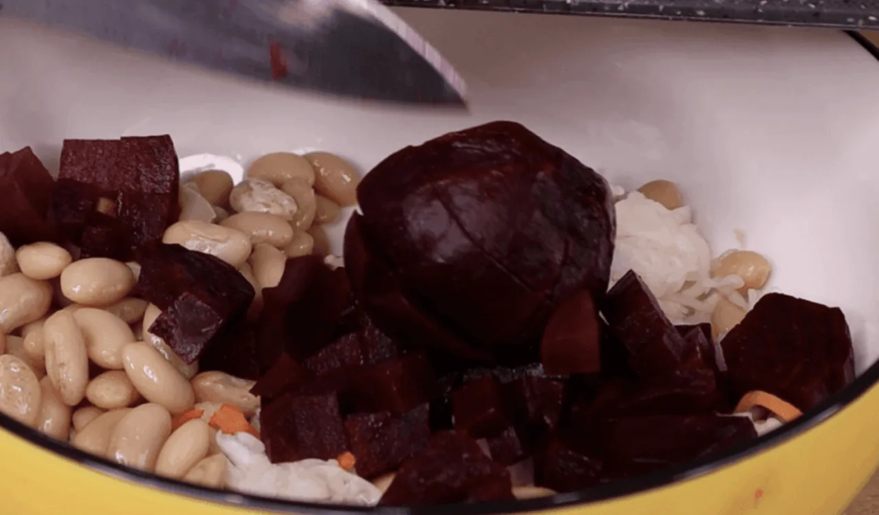 Буряк потрібно відварити або запекти в духовці. Очищаю і ріжу маленькими кубиками.