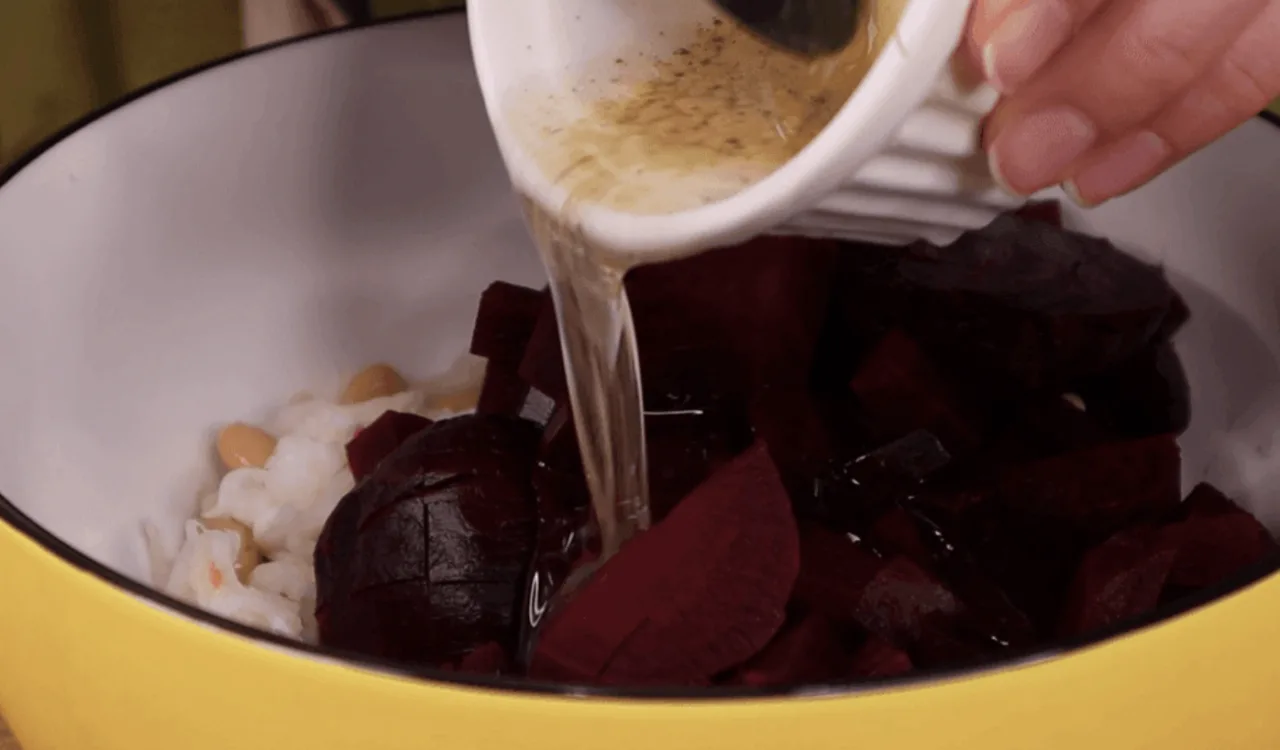 Для заправки я з’єдную рослинну олію, лимонний сік, гірчицю та сіль.