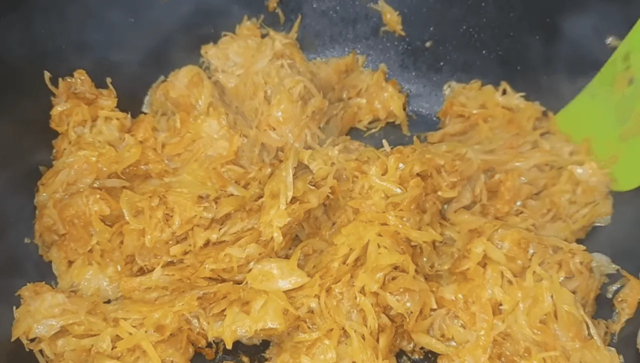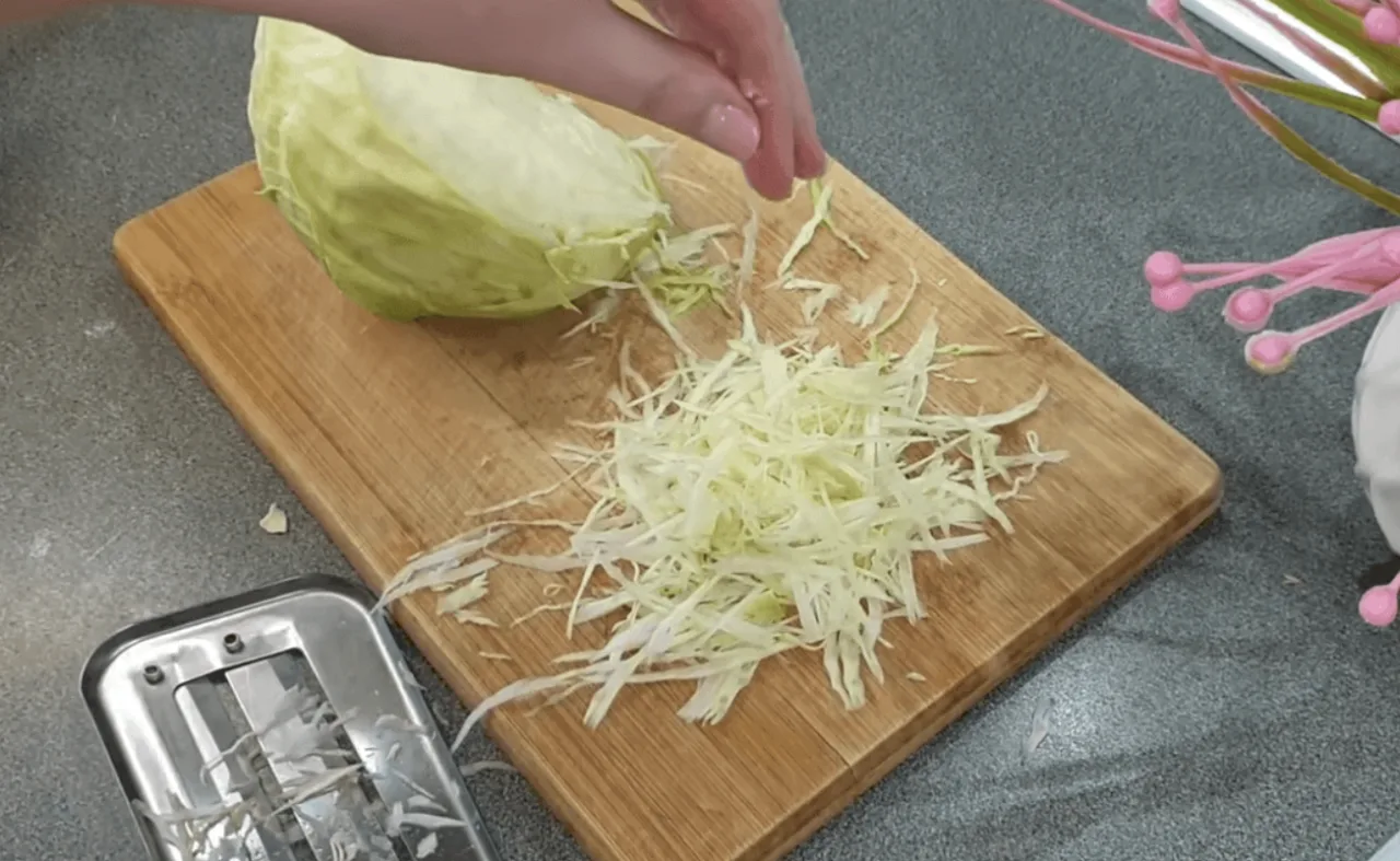Мені знадобиться 0.5 кг нашаткованої капусти. Капусту я заздалегідь підготувала: прибрала верхнє листя, промила його. Капусту я шаткую спеціальним ножем, щоб вийшла така стружка. Якщо шаткуєте звичайним ножем, то намагайтеся робити це якомога тонше.