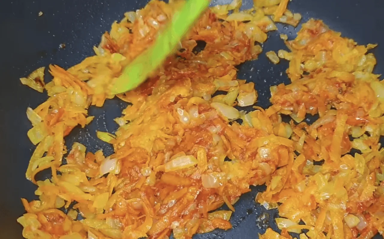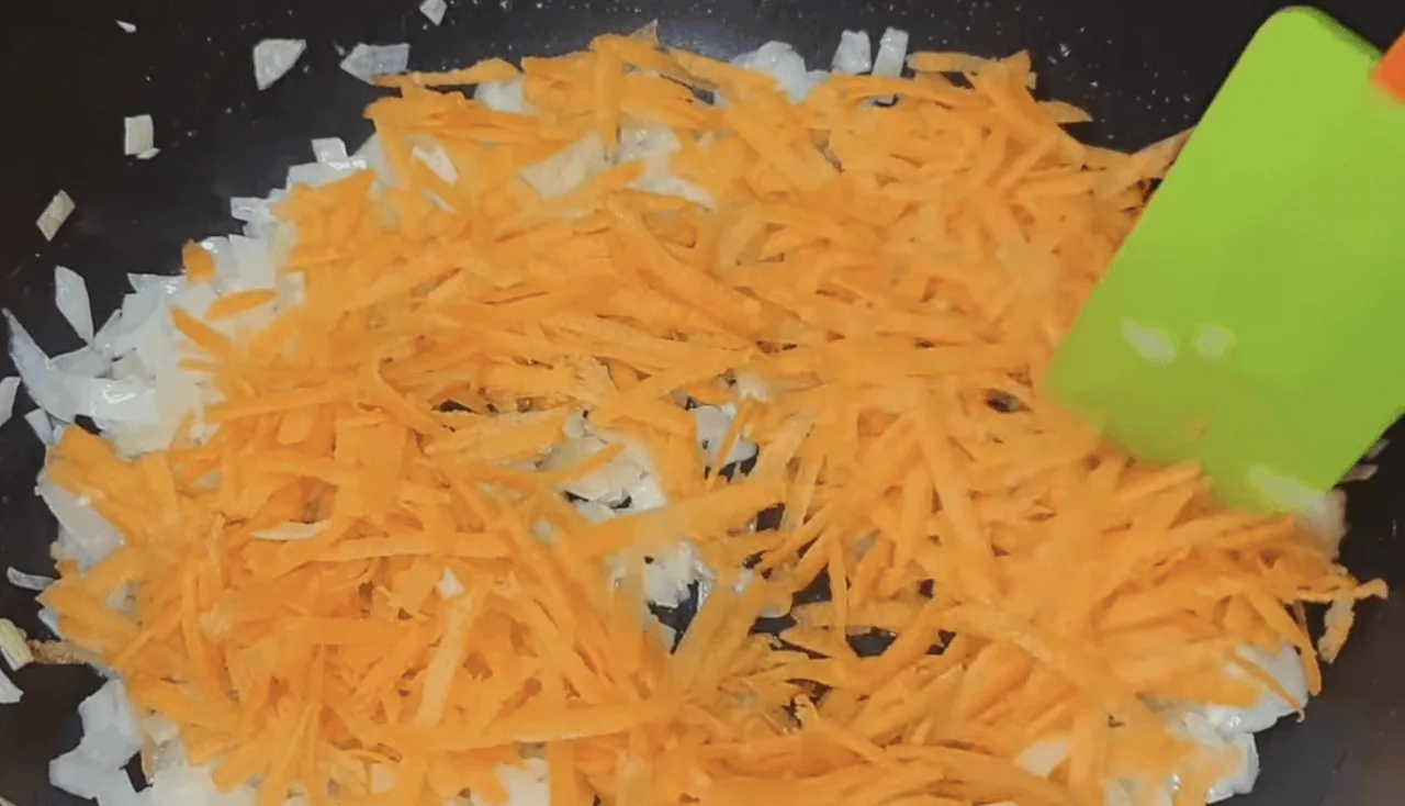 Обсмажуватиму цибулю з морквою, поки морква не почне віддавати свій сік і не почне золотитися.