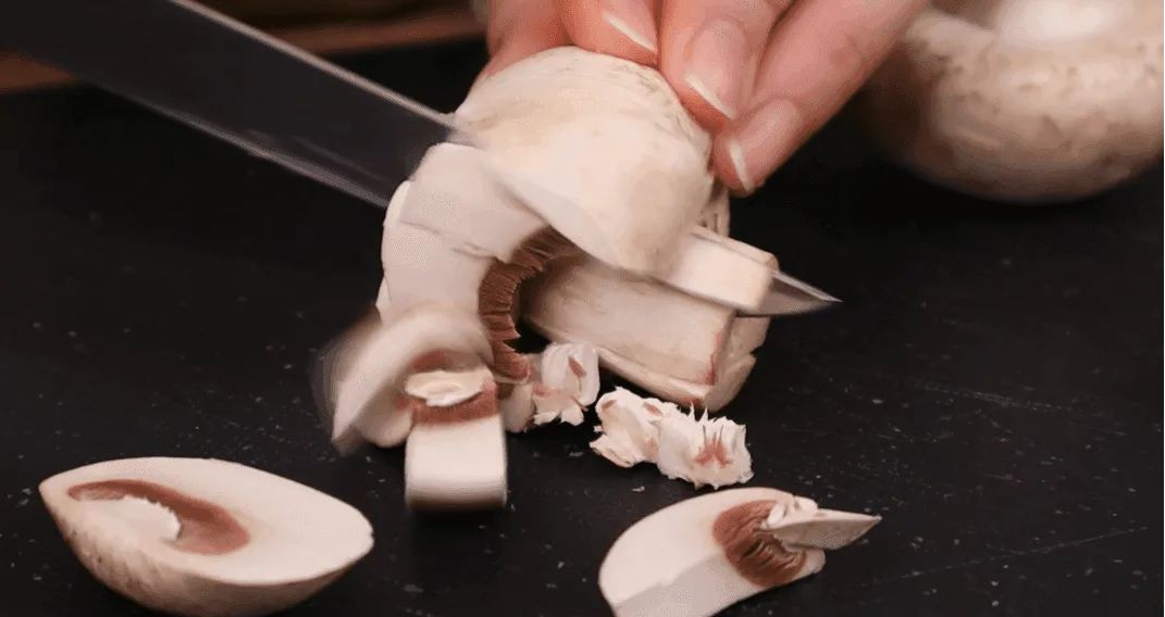 Потім ріжу печериці, але не дуже дрібно. Тут можна брати не лише печериці, можливо ви заготовляли восени білі гриби, з ними вийде ще смачніше. Велику ріпчасту цибулину ріжу кубиками.
