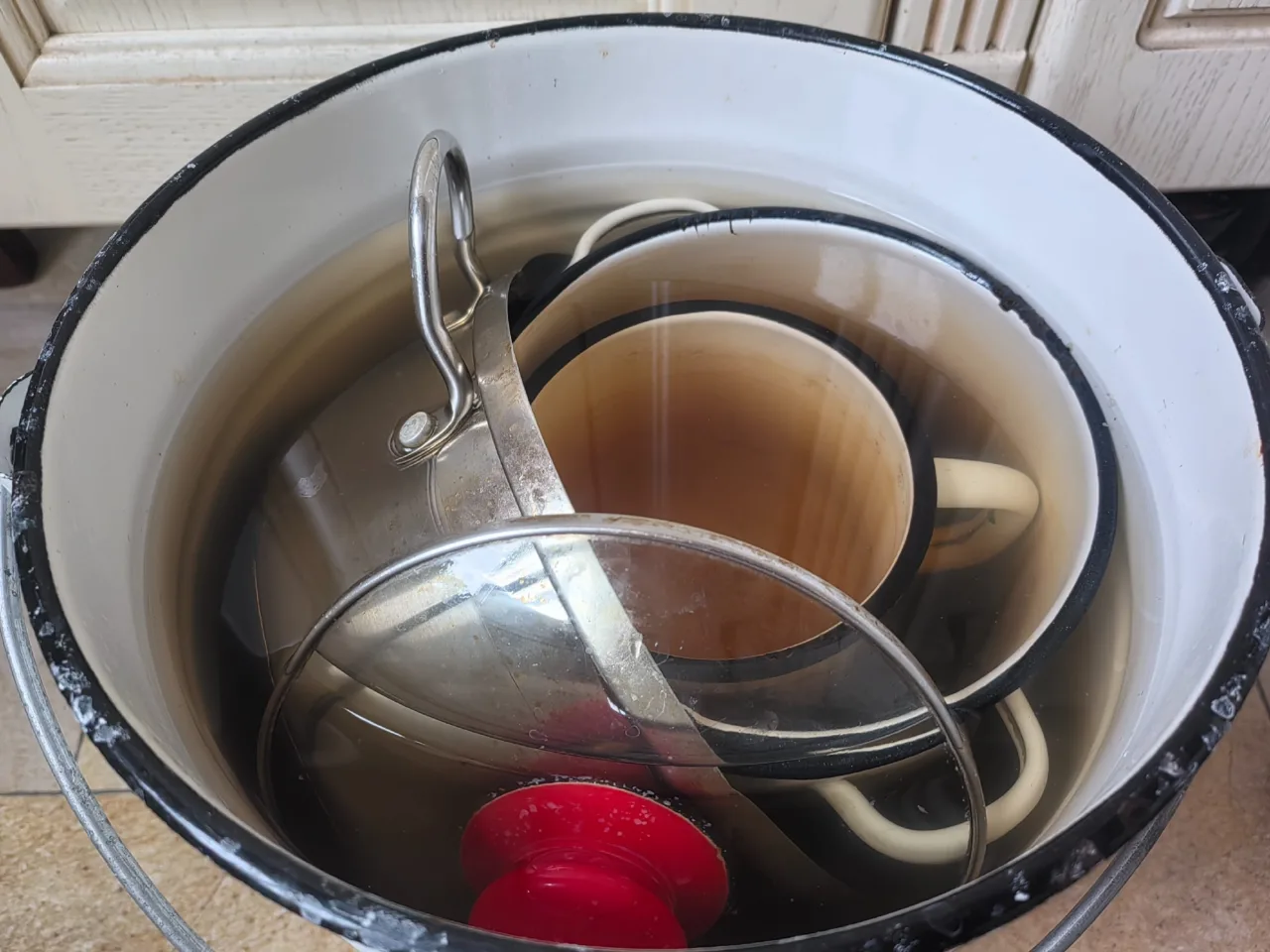 Половину стандартної пачки харчової соди я розводжу спочатку у невеликій кількості води. А як розійдеться, виливаю у відро. Туди ж наливаю теплої води стільки, щоб вистачило місця каструлькам та кришкам.
