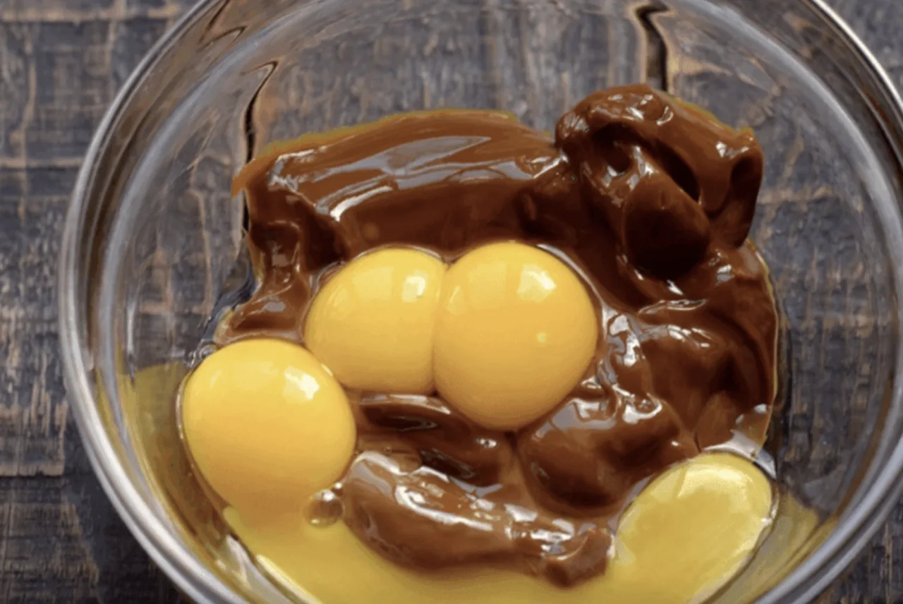 Згущене молоко та жовтки збийте занурювальним блендером до отримання однорідної маси.