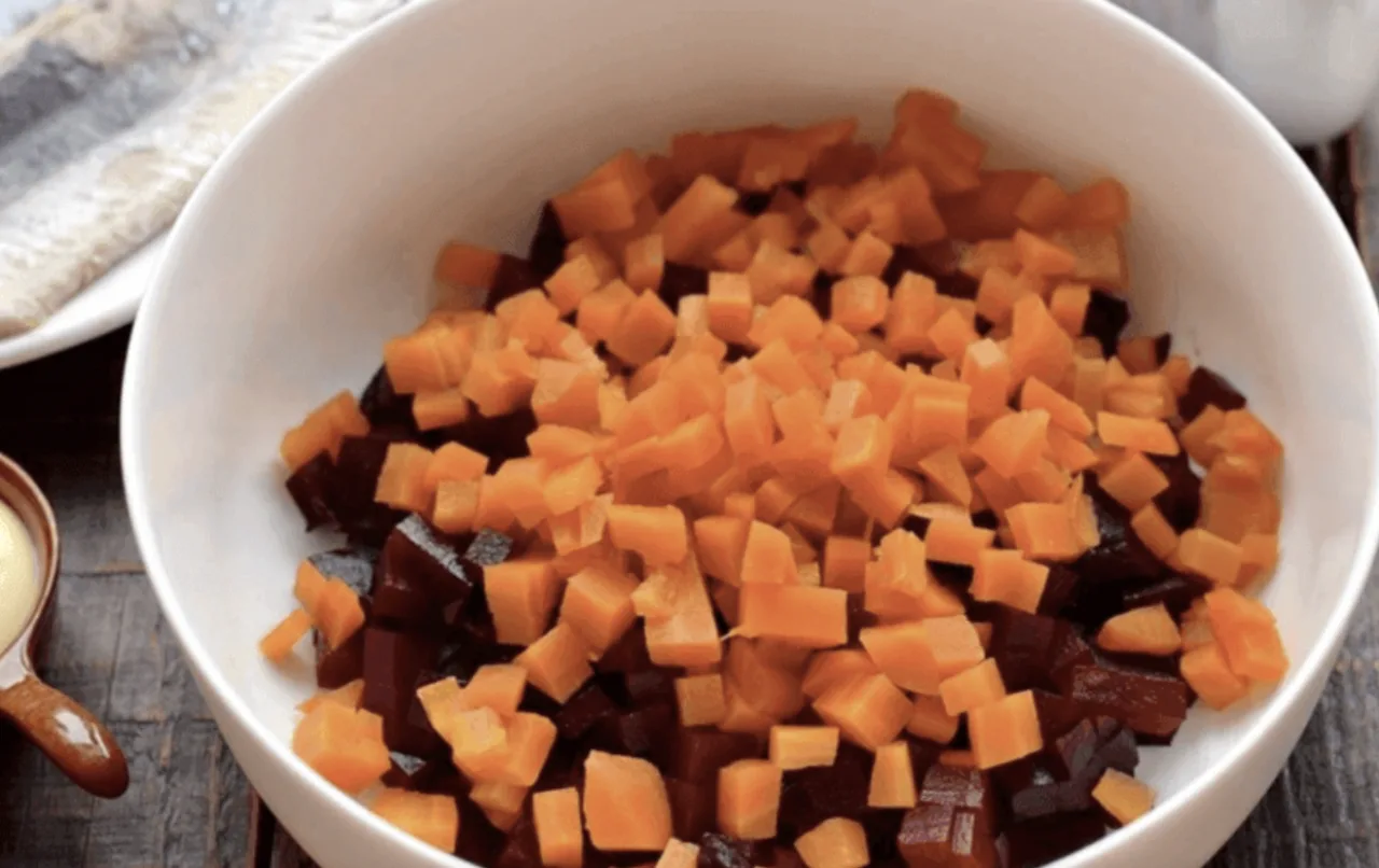 Відварюю овочі у шкірці, повністю остуджую та очищаю. Буряк нарізаю кубиком середнього розміру і відправляю в салатник. Моркву нарізаю, додаю до буряків.