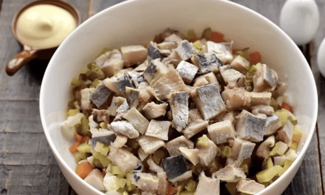 Яйця варю круто, охолоджую та нарізаю дрібним кубиком (можна натерти на крупній тертці). Солоні огірки нарізаю маленькими кубиками і додаю до основи. Філе оселедця нарізаю великими шматочками — вони повинні добре відчуватися в салаті.