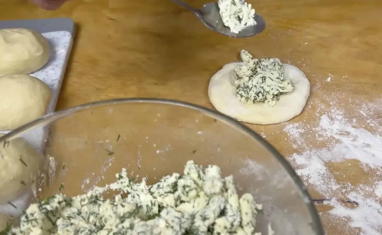 Відщипую шматочки по 40–50 г, формую кульки і даю їм відпочити 10 хвилин. Розкачую кульки в коржики, кладу начинку і добре защипую шов.