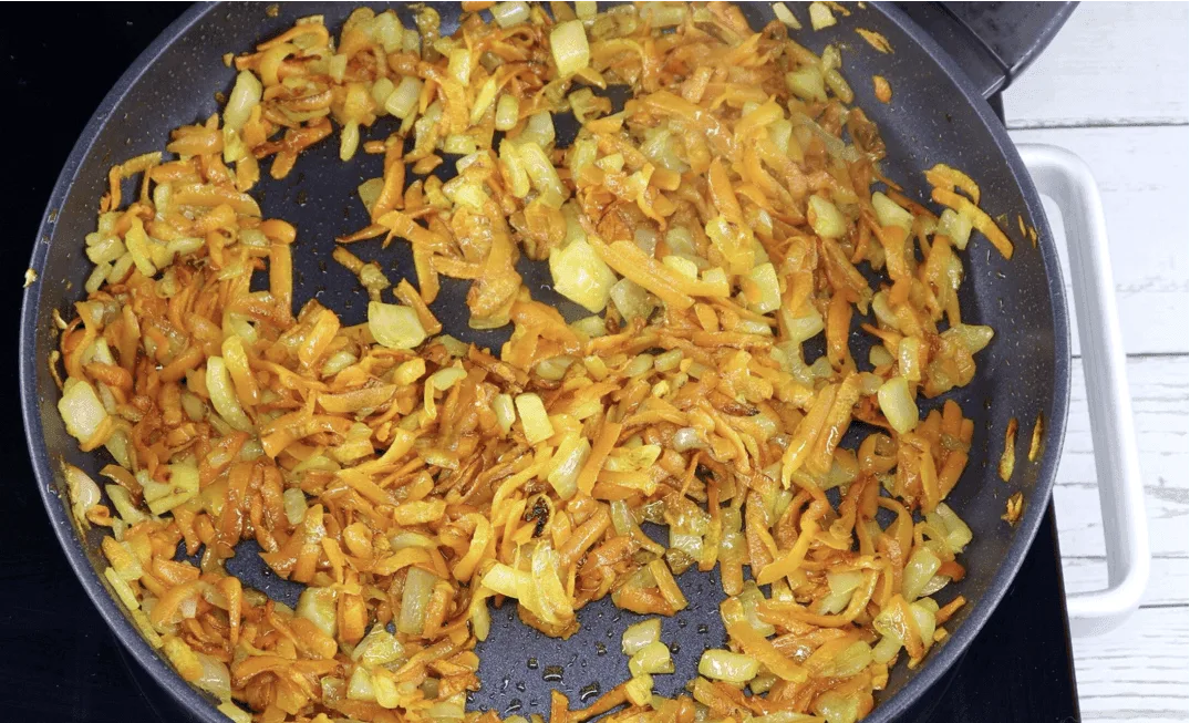 Готувати тушковану капусту ми будемо з додаванням цибулі та моркви. Ці овочі зроблять готову страву насиченою та смачною. У розігріту олію кладемо дві нарізані кубиком цибулини, обсмажуємо їх одну хвилинку і відправляємо сюди моркву, терту на великій тертці. Моркву та цибулю обсмажуємо разом 3 хвилини, додаємо 0,5 ч.л. солі і продовжуємо смажити до золотистого кольору, іноді помішуючи. Овочі готові.