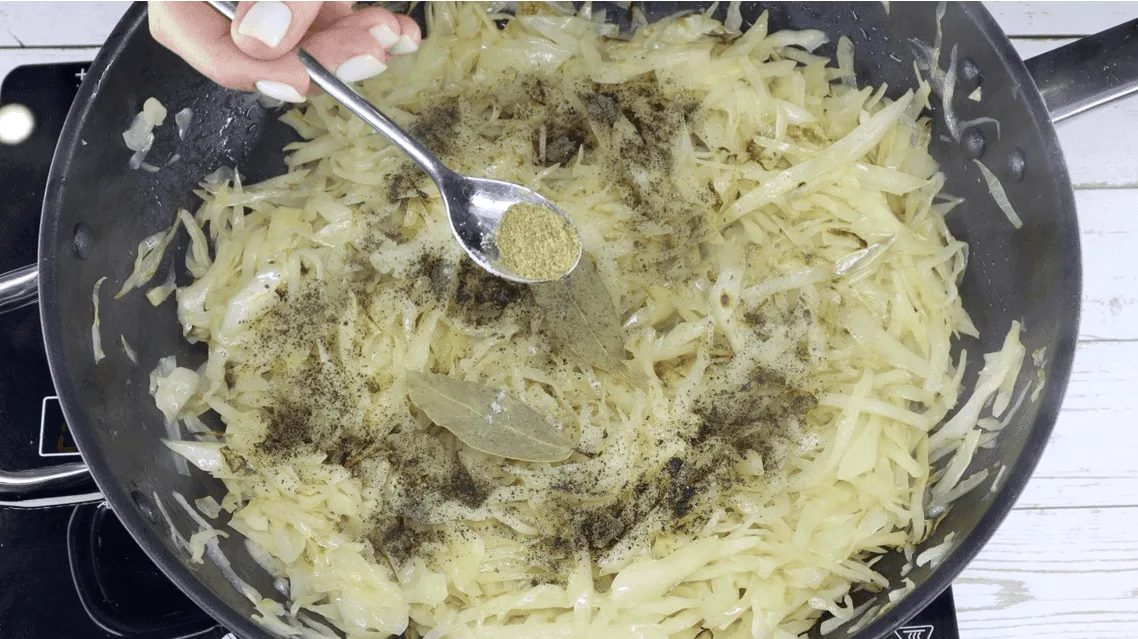 На початку готуємо на середньому вогні, безперервно помішуючи. Потім кладемо 2 лаврові листи, і на свій смак сіль і перець. Я поклала 1,5 ч.л. солі та 1 ч.л. чорного перцю. І в тушковану капусту я додаю 0,5 ч.л. меленого коріандру. Він надасть готовій страві витончений смак та аромат. Перемішуємо капусту зі спеціями та продовжуємо тримати на повільному вогні 15 хвилин, зрідка помішуючи.