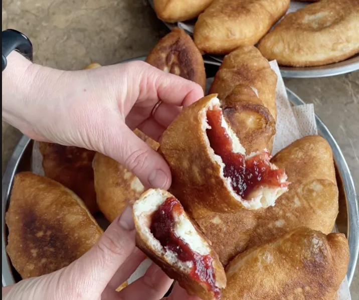 Я навіть не використовую качалку, а просто розтягую кульку руками, додаю начинку і защипую краї. Начинку беру різну: тушковану капусту, картоплю, сир або густе повидло.