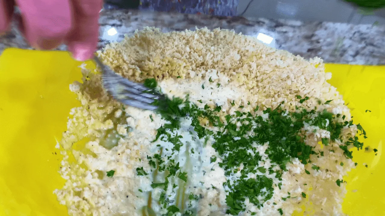Також у рецепті я використовуватиму сухарі для панірування та вершки, які відправляю в миску та перемішую. Додаю свіжу петрушку, фарш, обсмажену цибулю.