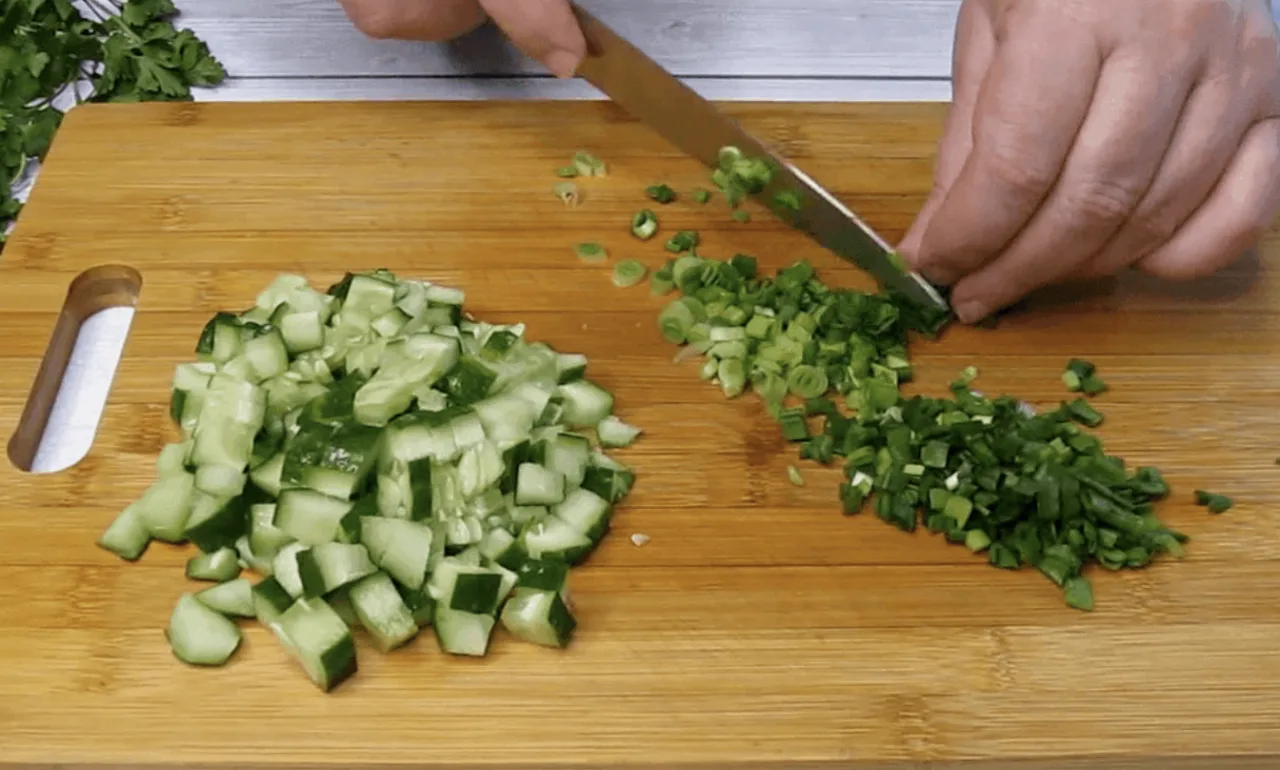 Ось і уся підготовка. Збираю салат. Яйця, огірок, зелень відправляю до салатника.
