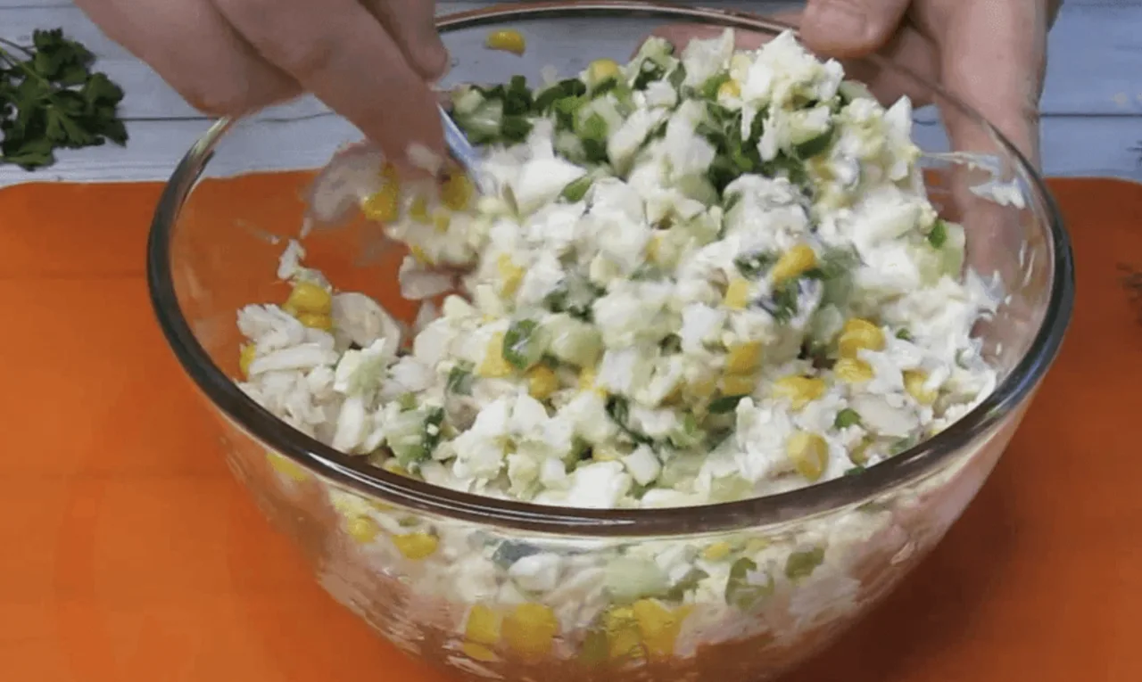 Додам 2-3 ст.ложки консервованої кукурудзи (як у класичному крабовому).